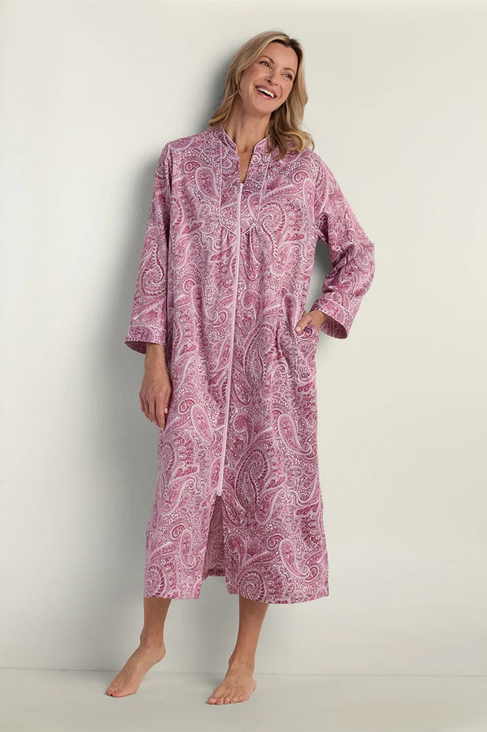 - رداء طويل من الساتان بظهر ممشط - أكملي مجموعة ملابس نومكِ بهذا الرداء الطويل بنقشة بيزلي أنيقة بلون عنابي مميز. يتميز هذا التصميم الأنيق بسحاب أمامي وجيوب جانبية عملية، وأكمام طويلة مريحة، وطول مريح حتى منتصف الساق لتغطية استثنائية. هذا الرداء الأنيق مثالي لروتينكِ الصباحي أو للاسترخاء في المساء، حيث يجمع بين الأناقة والراحة في منزلكِ.