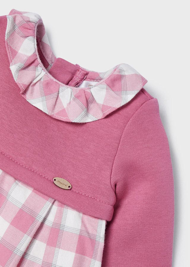 Long sleeve dress for newborn. Round neck with ruffle. Invisible back zipper closure.
