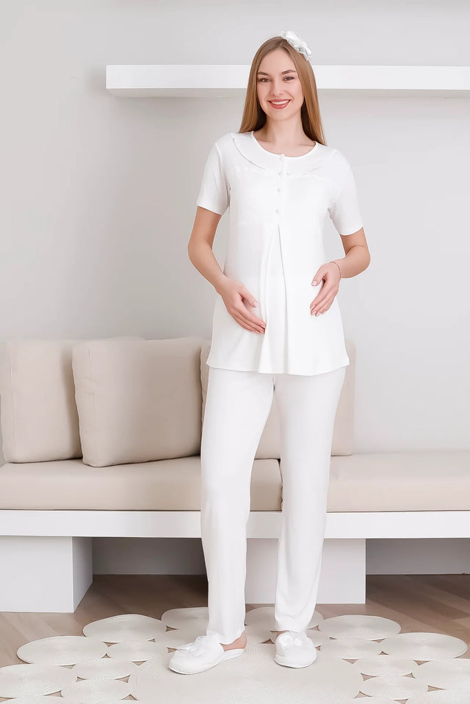 Melisa Pajama and Dressing Gown Set / 3-Piece Maternity & Pregnancy Set / Short Sleeve, Buttoned Front Pajamas - 3436