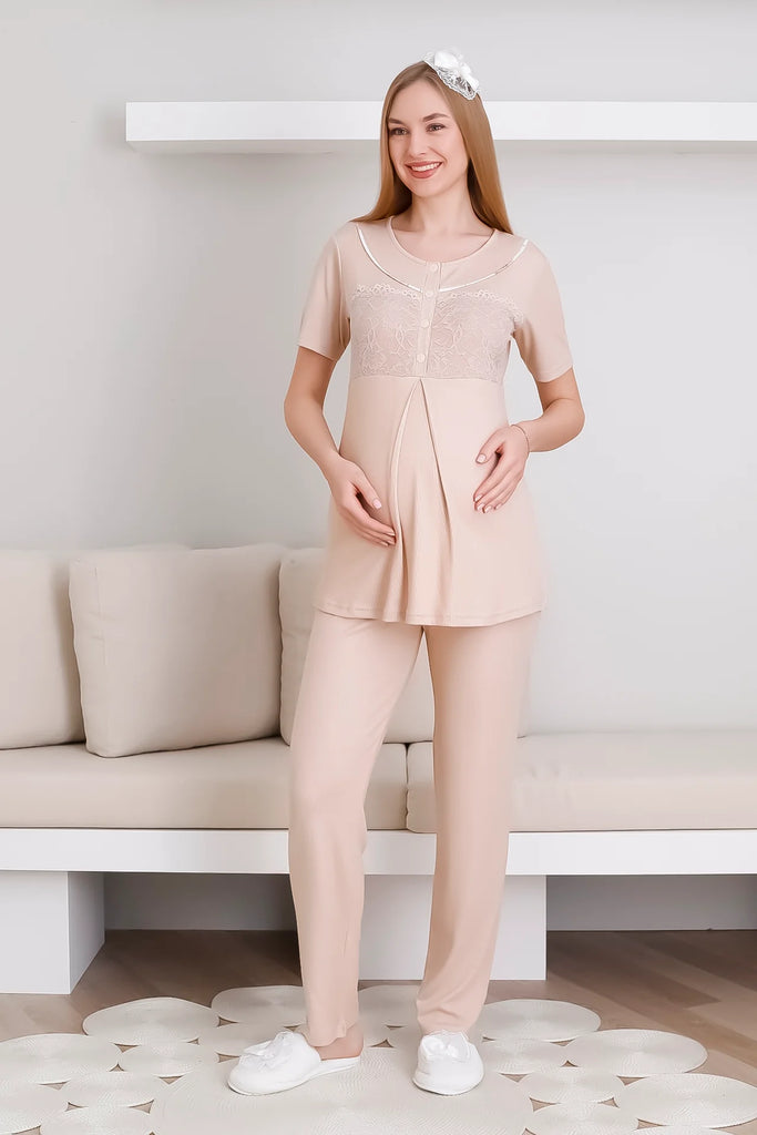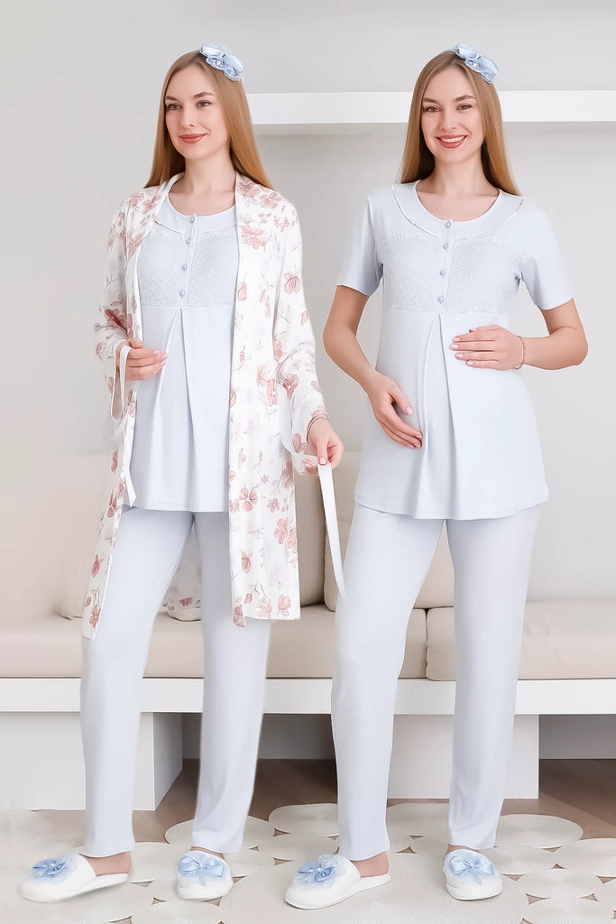 This set, which will adorn the wardrobe of every expectant mother and new mother with its soft texture and elegance, offers both comfort and an aesthetic look. This pajama and dressing gown combination, specially designed for expectant mothers, makes a difference with its unique details. It is suitable for all environments and provides warmth and privacy with its dressing gown, which you can use before pregnancy, in the hospital and after pregnancy.