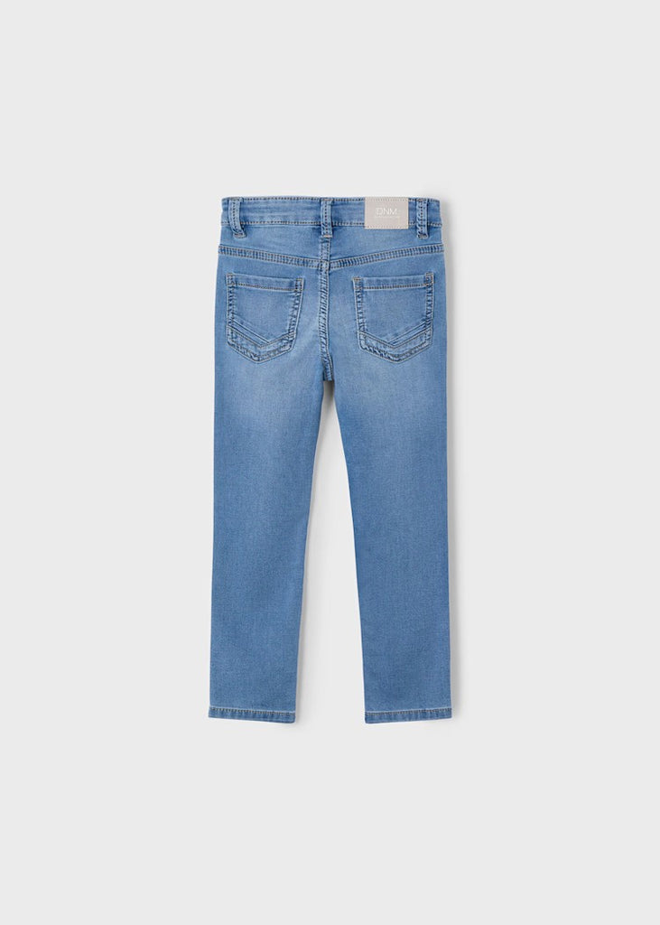 Slim fit boys' long trousers. Zip and button closure. Adjustable elastic waistband with buttons for a better fit. Comfortable, versatile denim for everyday looks. Functional front pockets. Functional back pockets. For safety reasons, smaller sizes (2-5 years) will not have a zipper fly, but a simulated one.