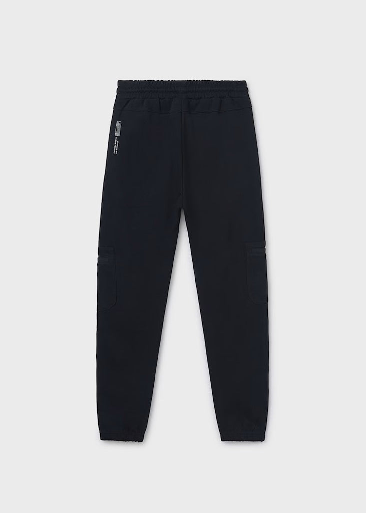 Pantalón largo para chico de silueta training, con cinturilla y bajos elásticos. Cinturilla elástica con cordón. Diseño con múltiples bolsillos. Elementos de adorno: serigrafía (print).