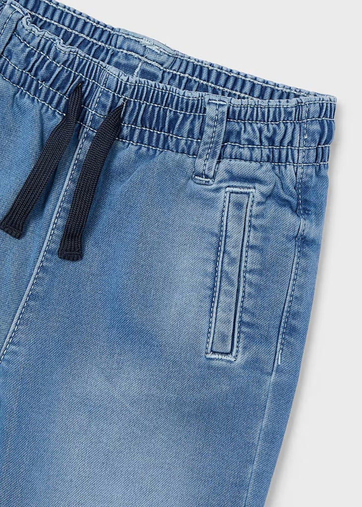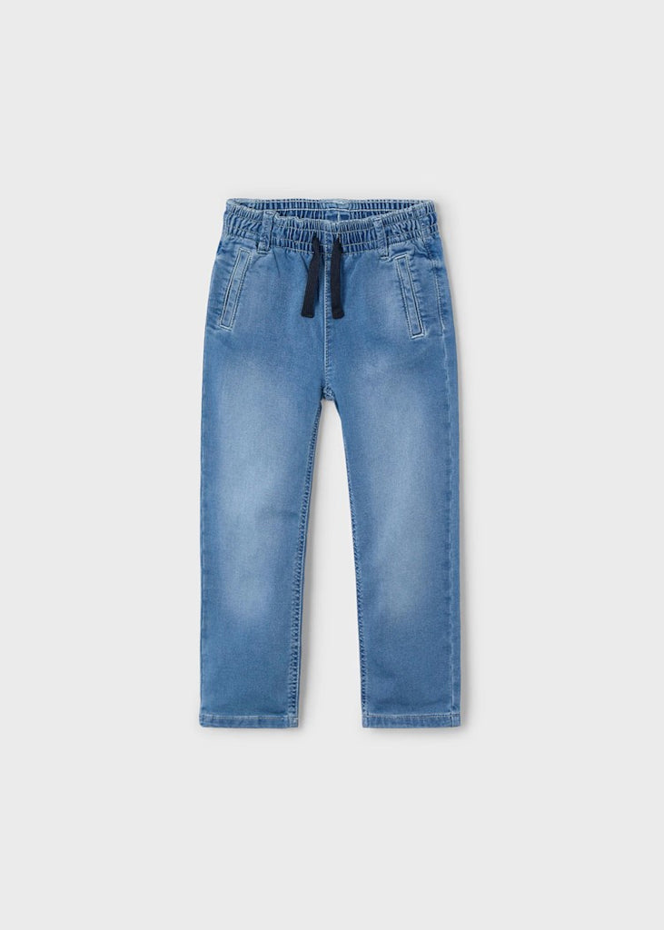 Boys' long jogger pants, loose at the top and narrower toward the ankle. Perfect for sporty looks, reflecting the influence of athleisure in streetwear. Elastic waistband with drawstring. Comfortable, versatile denim for everyday looks. Multi-pocket design.