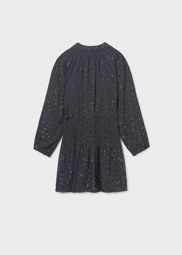 فستان بناتي بأكمام طويلة. ياقة ماندرين متناسقة. مصنوع من قماش شيفون خفيف الوزن. يتميز بتفاصيل مطرزة.