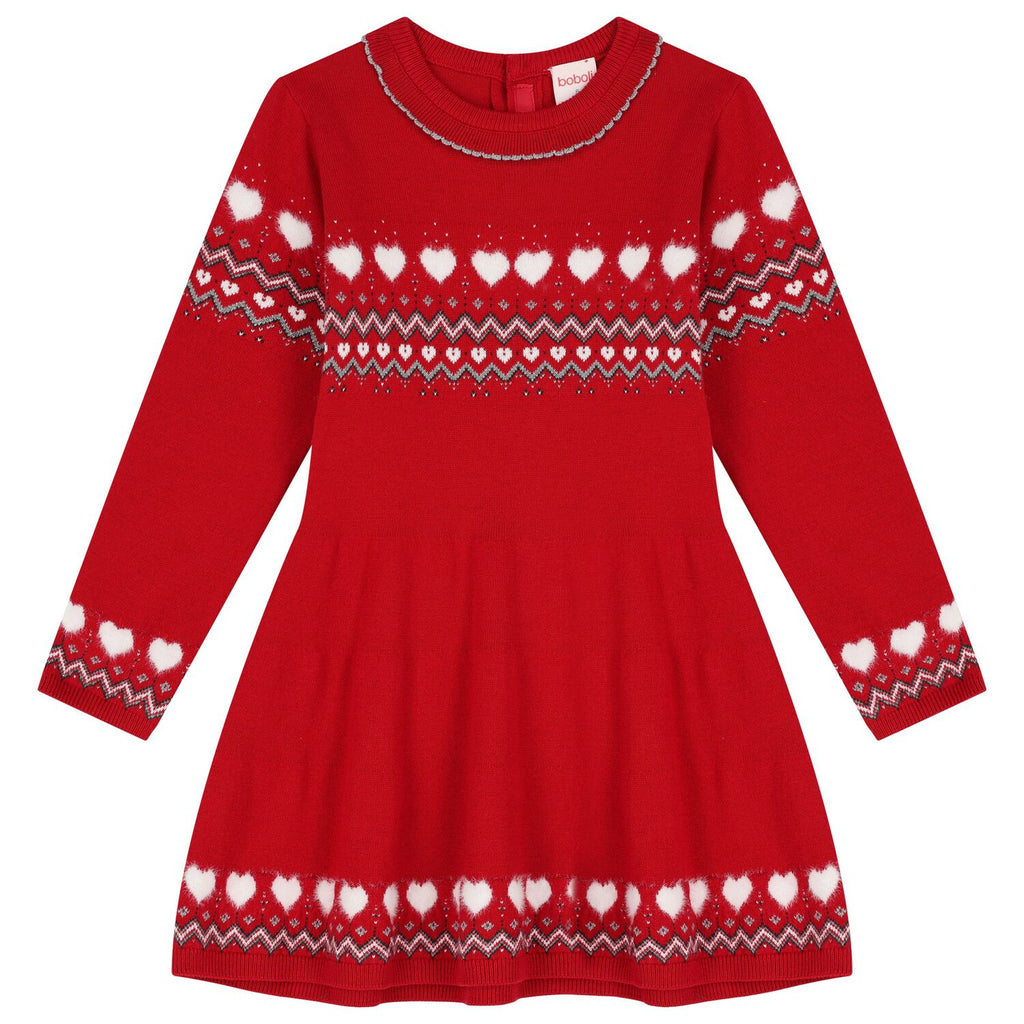 فستان أحمر للبنات من بوبولي. مصنوع من مزيج قطني ناعم، يتميز بنقشة قلب أبيض ونمط متعرج. يتميز بتطريز فضي على شكل صدفة حول فتحة العنق، ويُغلق بأزرار على شكل قلب من الخلف
