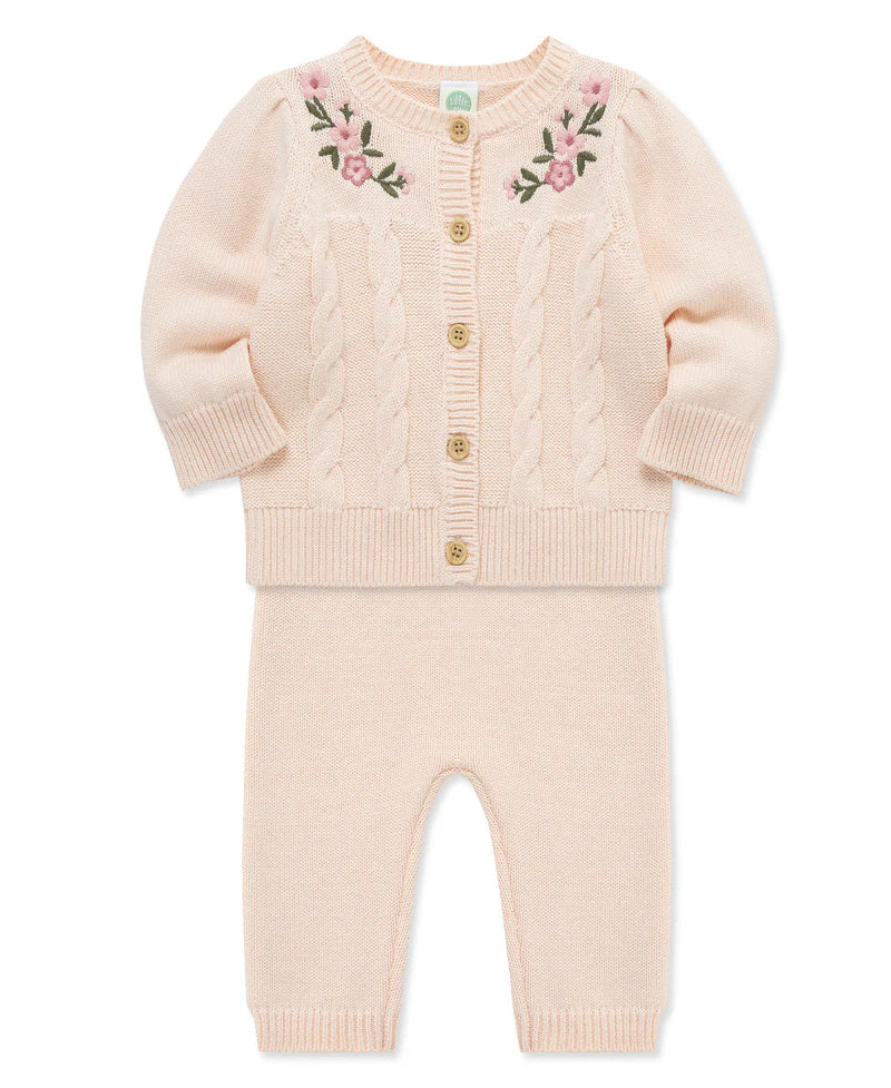 طقم كنزة مريح للفتيات الصغيرات، مزين بزهور رقيقة على طول خط العنق وبنطال متناسق. ١٠٠٪ قطن خالٍ من مثبطات اللهب مستورد قابل للغسل في الغسالة بماء بارد، والتجفيف بالمجفف على درجة حرارة منخفضة