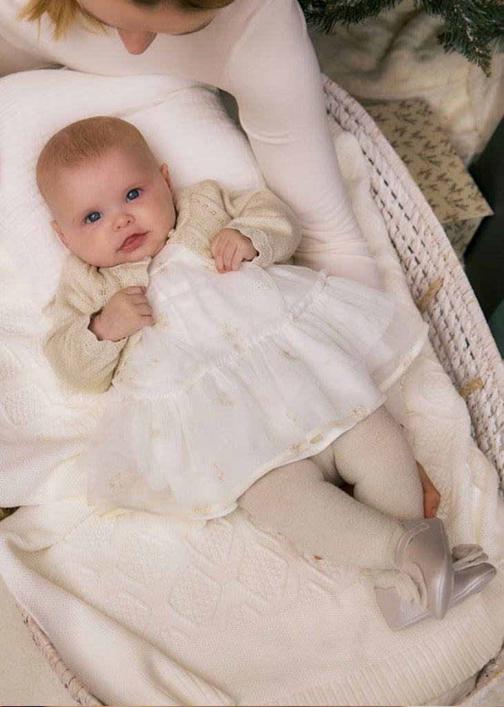 فستان بأكمام طويلة لطفلة حديثة الولادة. رقبة دائرية. سحاب خلفي مخفي. مزيج من الأقمشة يُضفي تصميمًا فريدًا ومميزًا. مبطن بالكامل. يتميز بقماش تيري وكشكشة