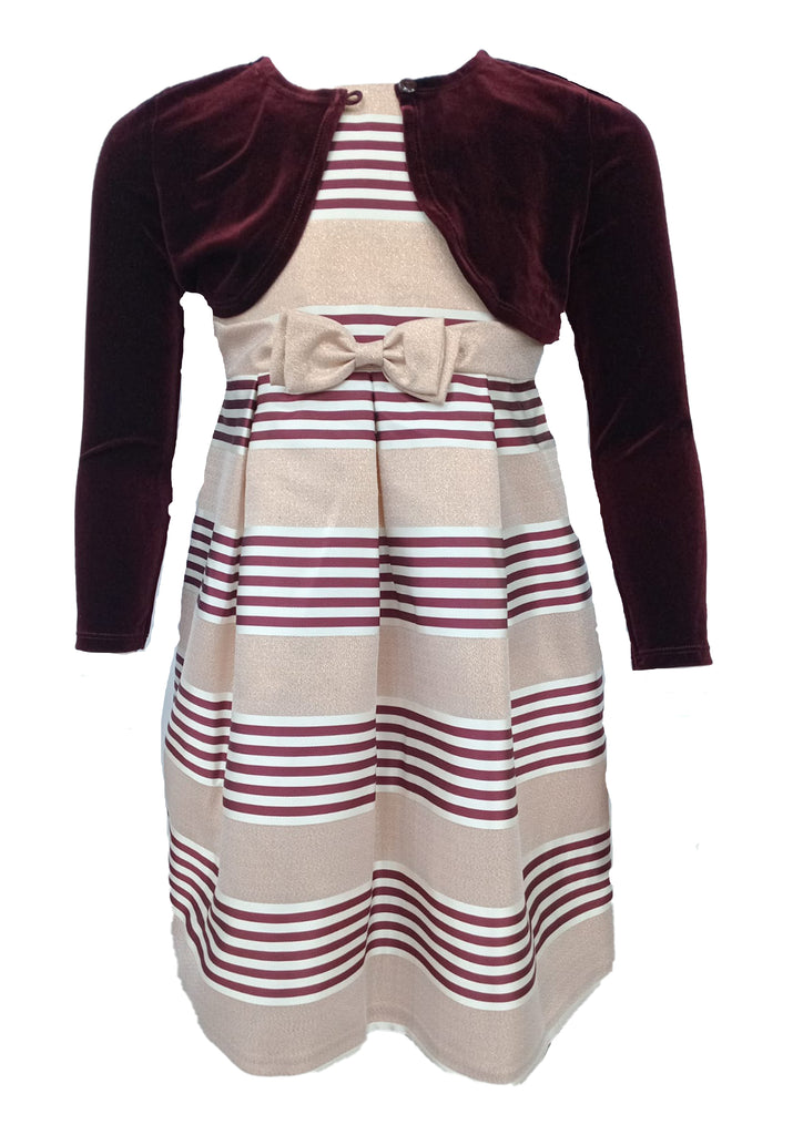 - الفستان بدون أكمام، مصنوع من قماش الجاكار المخطط الجميل باللون الخمري والذهبي الوردي والبورغندي. فيونكة جميلة بلون ذهبي وردي على الخصر الأمامي. الجزء الخلفي به سحاب للإغلاق. . كارديغان بأكمام طويلة بلون بورغندي مطابق مصنوع من قماش مخملي مطاطي مع زر إغلاق واحد في الأعلى.
