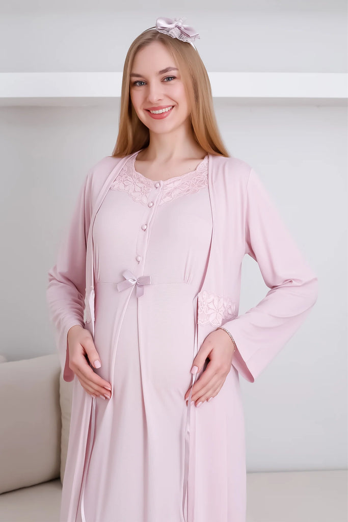 Lace V Neck Maternity & Postpartum Nightgown and Dressing Gown Set - 2292