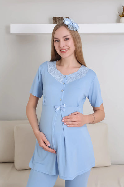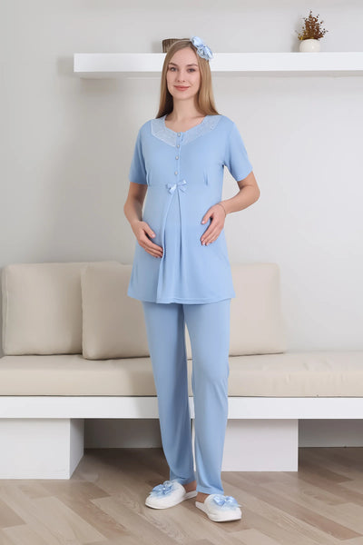 Maternity Pajama Set / Short Sleeve Pajamas Long Lace Detail Dressing Gown Set / Maternity Cotton Pajamas - 3435