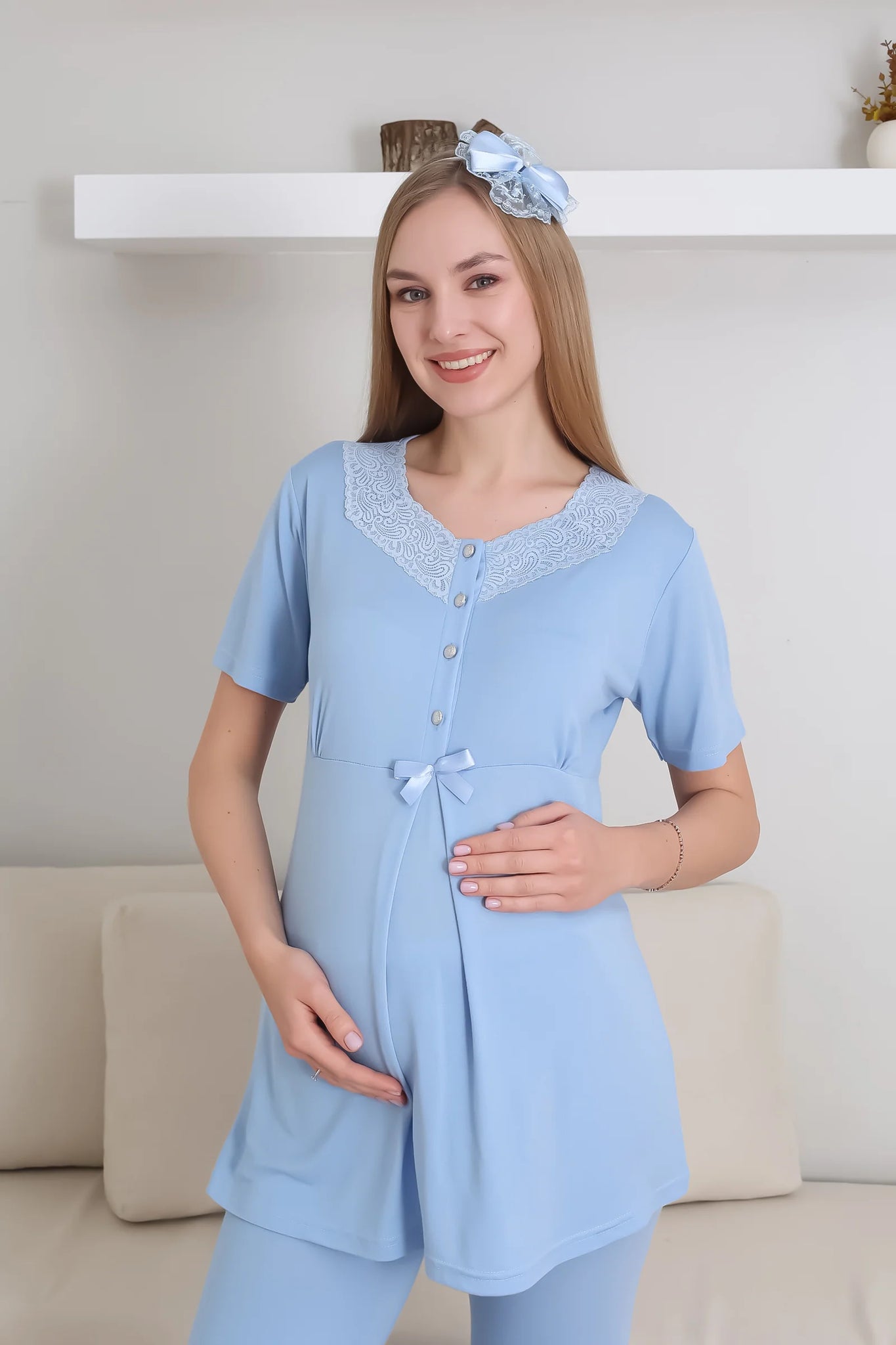 Maternity Pajama Set / Short Sleeve Pajamas Long Lace Detail Dressing Gown Set / Maternity Cotton Pajamas