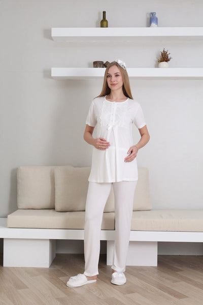 Maternity Short Sleeve Pajamas and Long Sleeve Dressing Gown Set/ Button Lace Collar and Sleeve - 3433