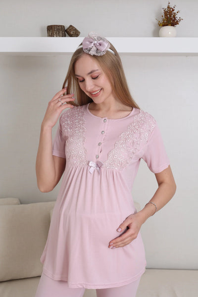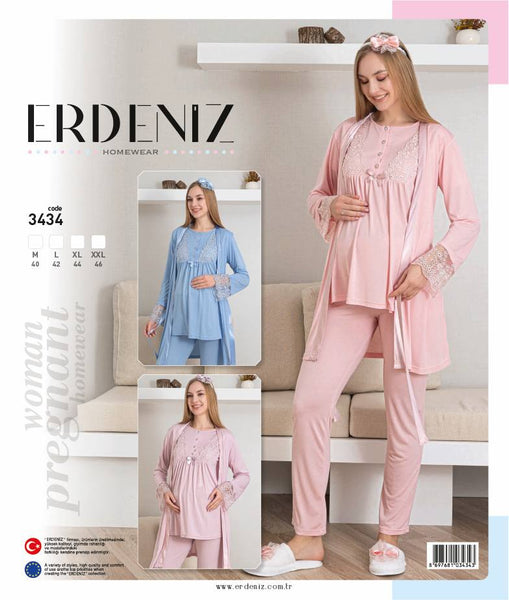 Short Sleeve Crew Neck Maternity & Postpartum Pajama Set / 3 Piece Pajamas and Dressing Gown Maternity Clothing - 3434