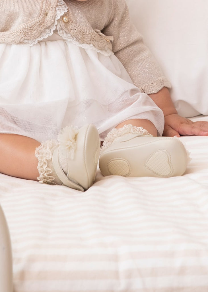 Mary Janes type shoes for newborns, with a classic and timeless style for their most elegant outfits. Inner lining and breathable cotton insole . Adjustable velcro closure that guarantees perfect foot support. All of our shoes are made with chemical-free embellishments . This item is presented in a box from the Newborn line, ideal for giving away on special occasions.