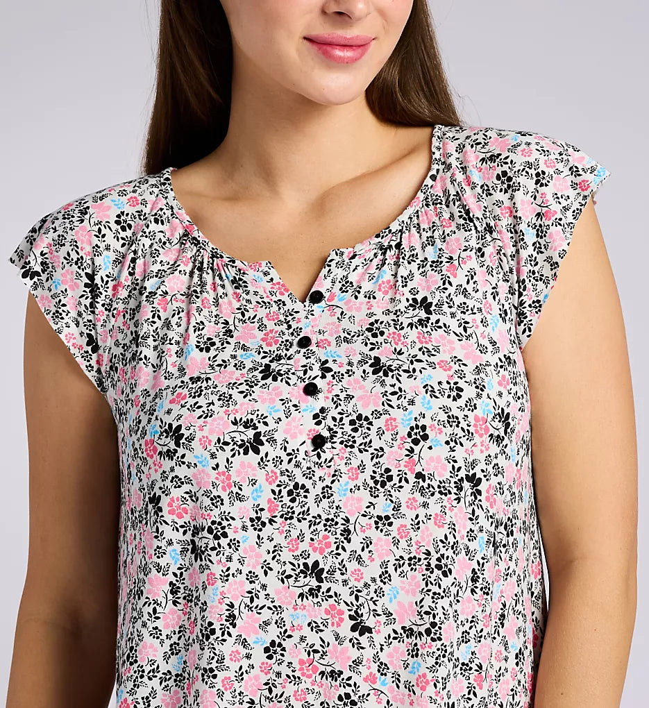 Comfortable floral sleep set offers softness and breathability. Made of a knit blend of rayon and spandex.