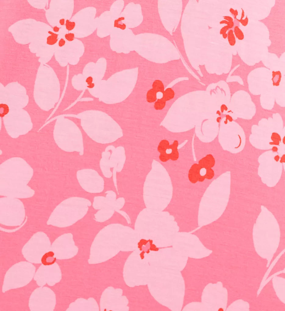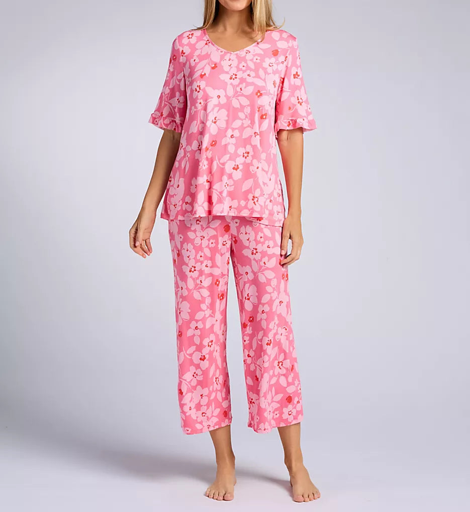Breathable short-length pajama set with a soft, light feel and a floral graphic print. Made of a jersey-knit blend of rayon and spandex.