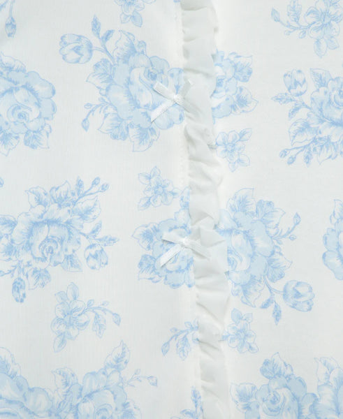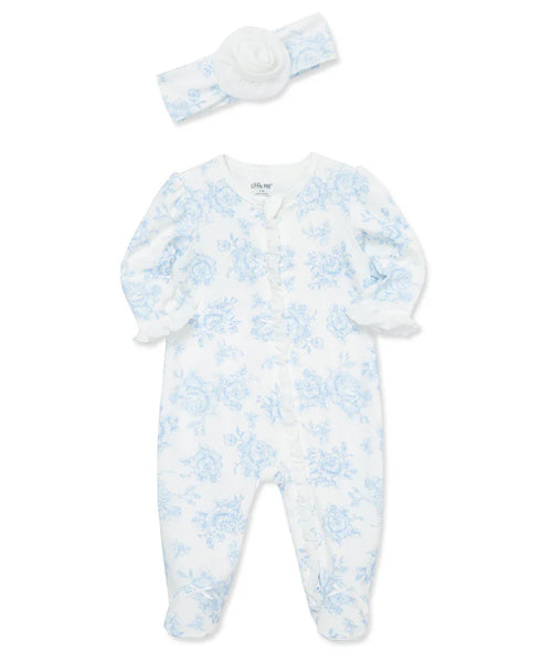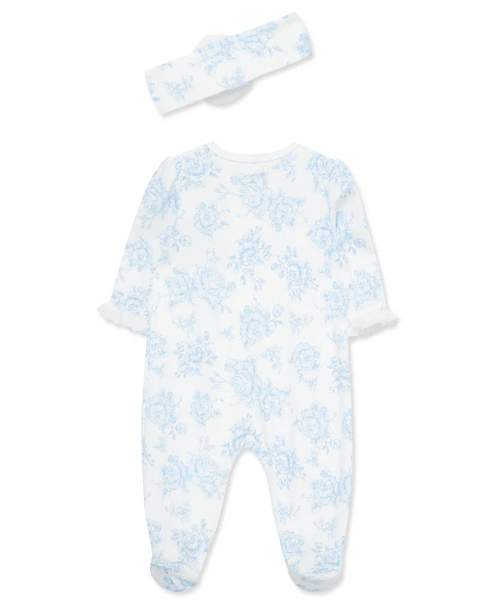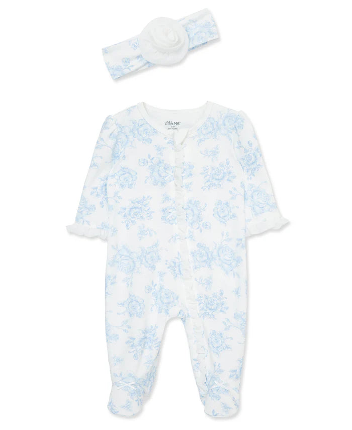- A pretty blue rose print covers this newborn footie and headband set for your baby girl.