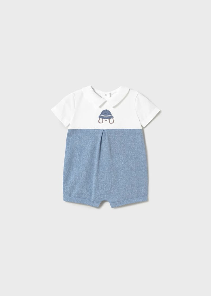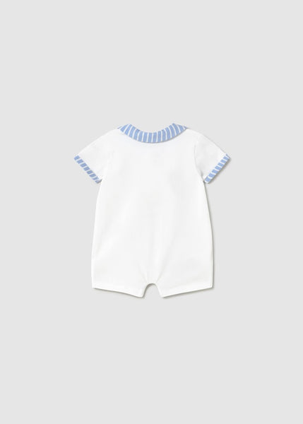 Short-sleeved newborn onesie. Shirt collar. Button closure at the front. Button closure at the crotch.