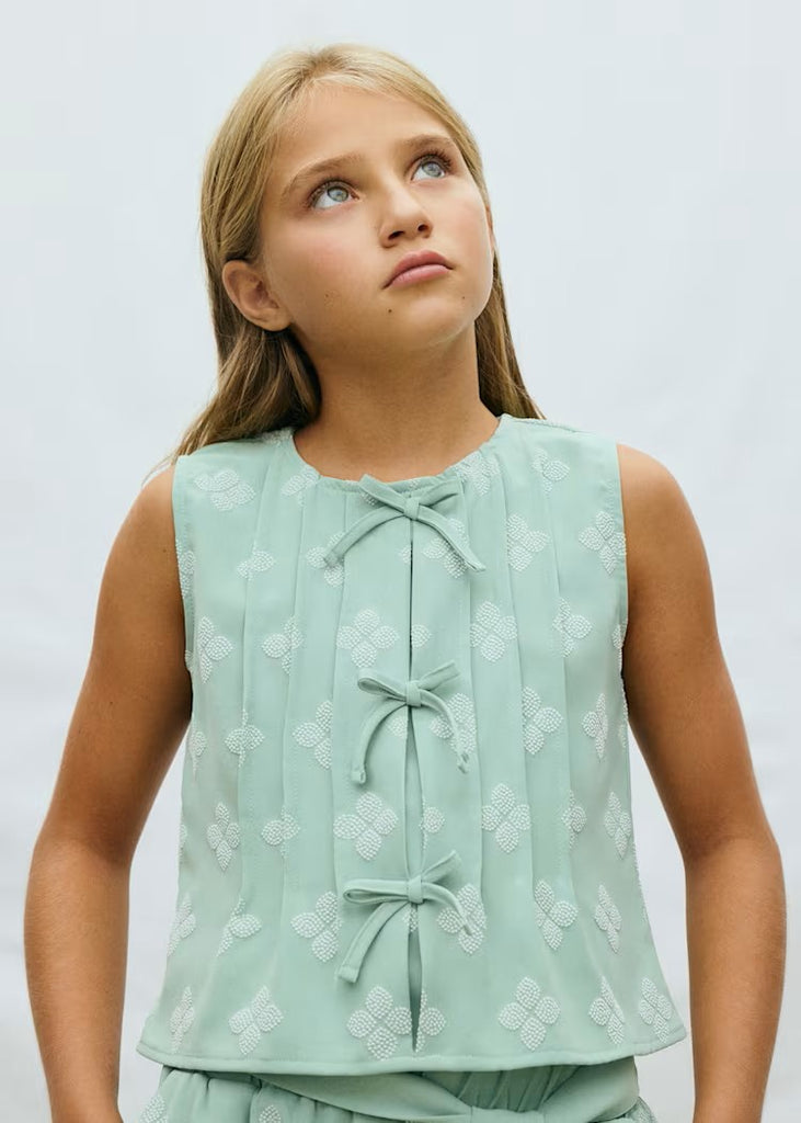- Top: A sleeveless, light green printed top with a round neckline and decorative bows on the front. It is made of 100% polyester.