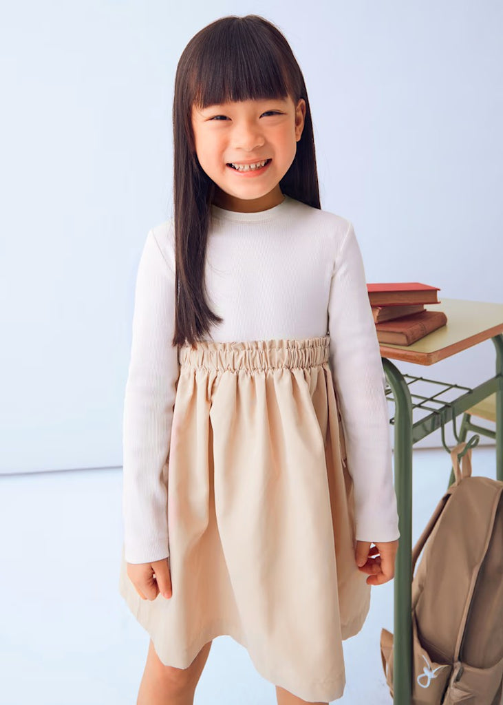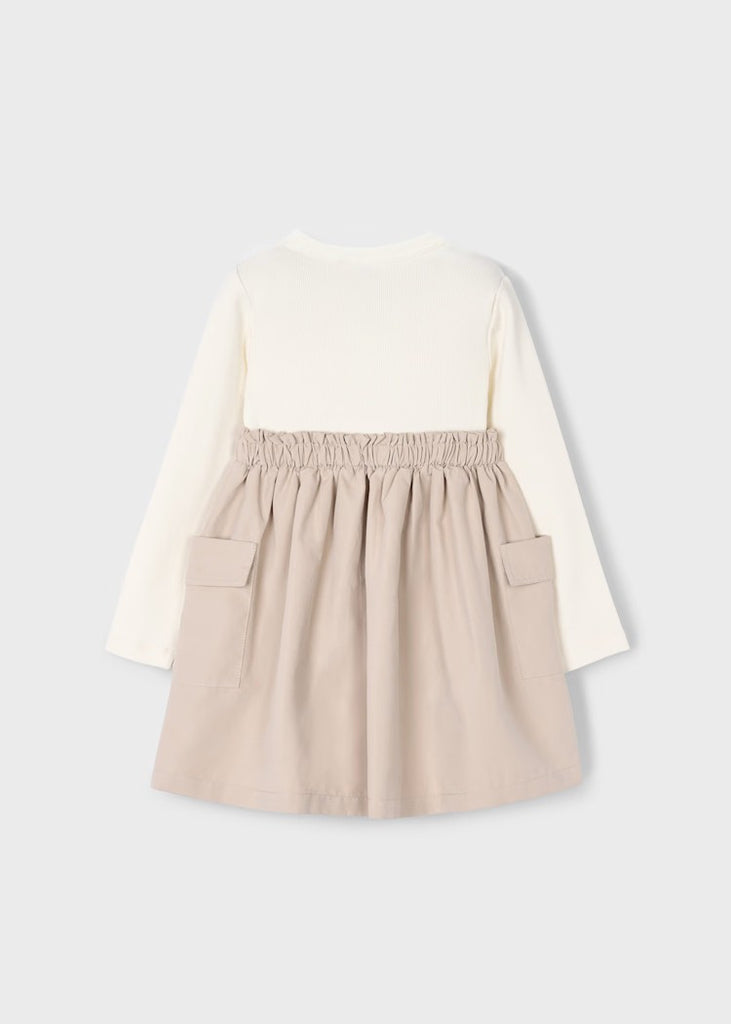فستان بناتي بأكمام طويلة. رقبة دائرية. تصميم متداخل مع تيشيرت. خصر مطاطي. تصميم مدمج مع صدّار وتنورة بأقمشة مختلفة لإطلالة فريدة ومميزة. يتميز بحاشية مكشكشة. جيوب جانبية.