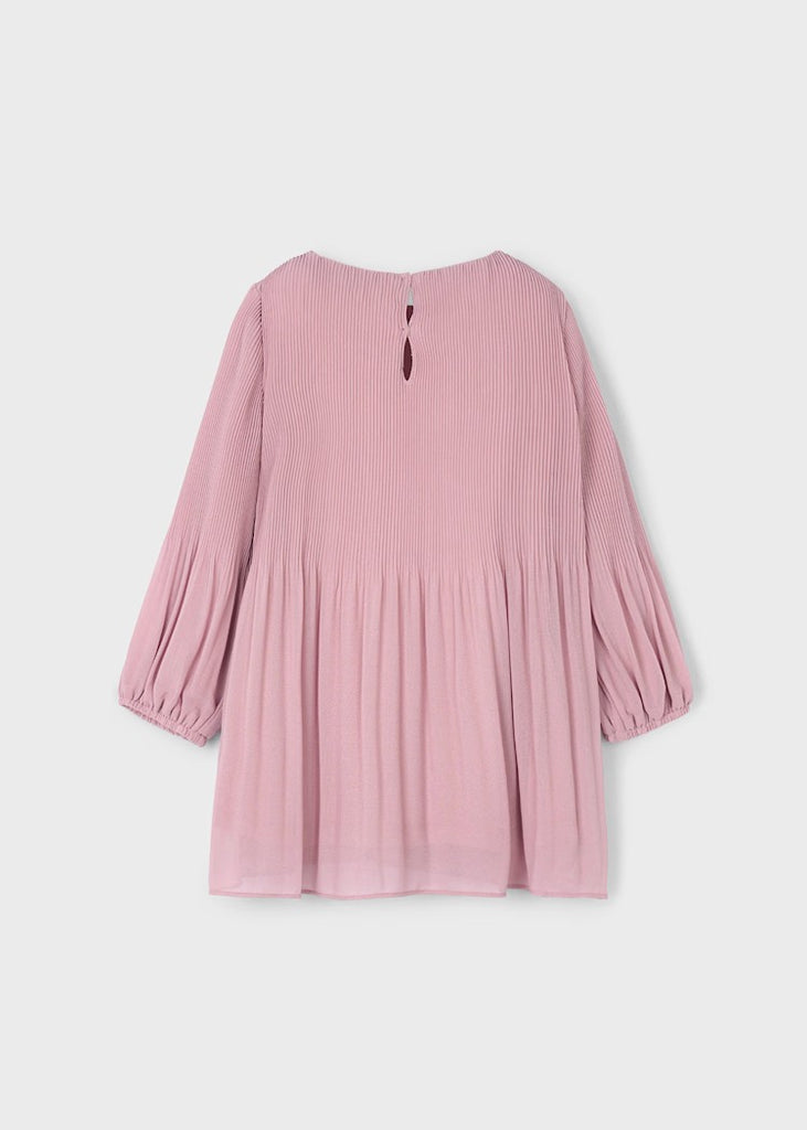 فستان بناتي بأكمام طويلة وأساور مطاطية. فتحة صغيرة في الخلف مزودة بزر للإغلاق لسهولة الارتداء. قماش شيفون انسيابي. بطانة داخلية ناعمة من البوليستر. تصميم مطوي.
