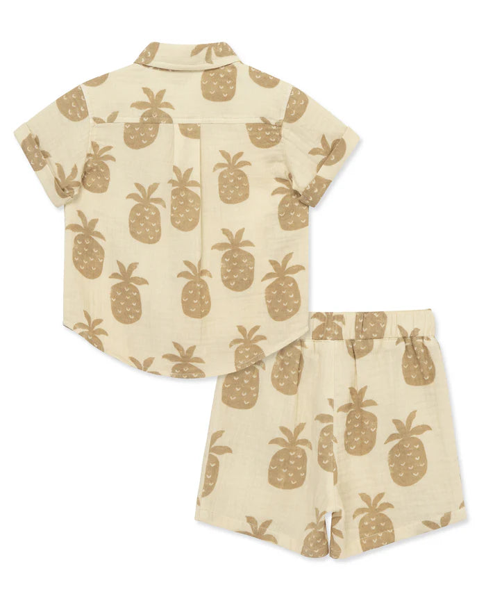 - He'll be sweet from the inside out in this infant boys' 2-piece pineapple short set! This woven cotton set includes a short-sleeve button-down and matching shorts.