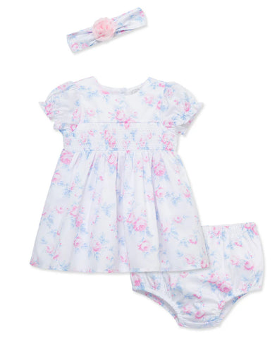 Little Me 3-piece set, 2 short-sleeved dresses with a diaper cover and a hairband, pink cotton bunny design for girls 15589