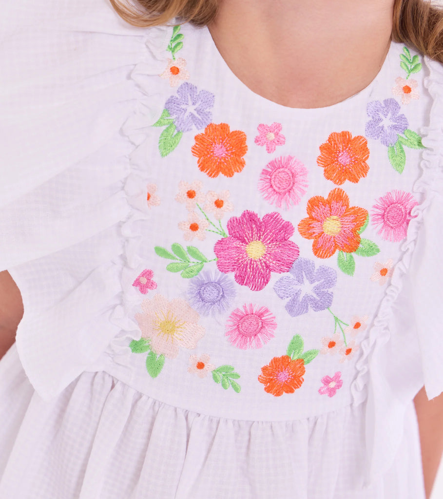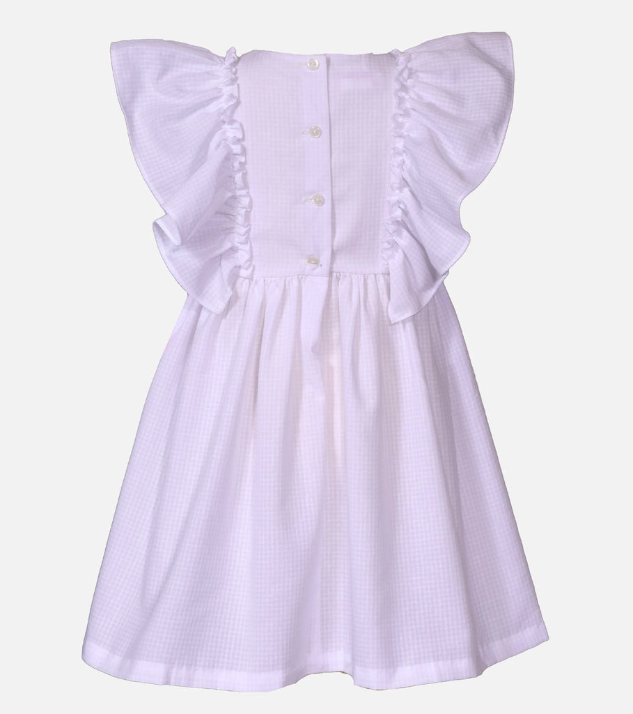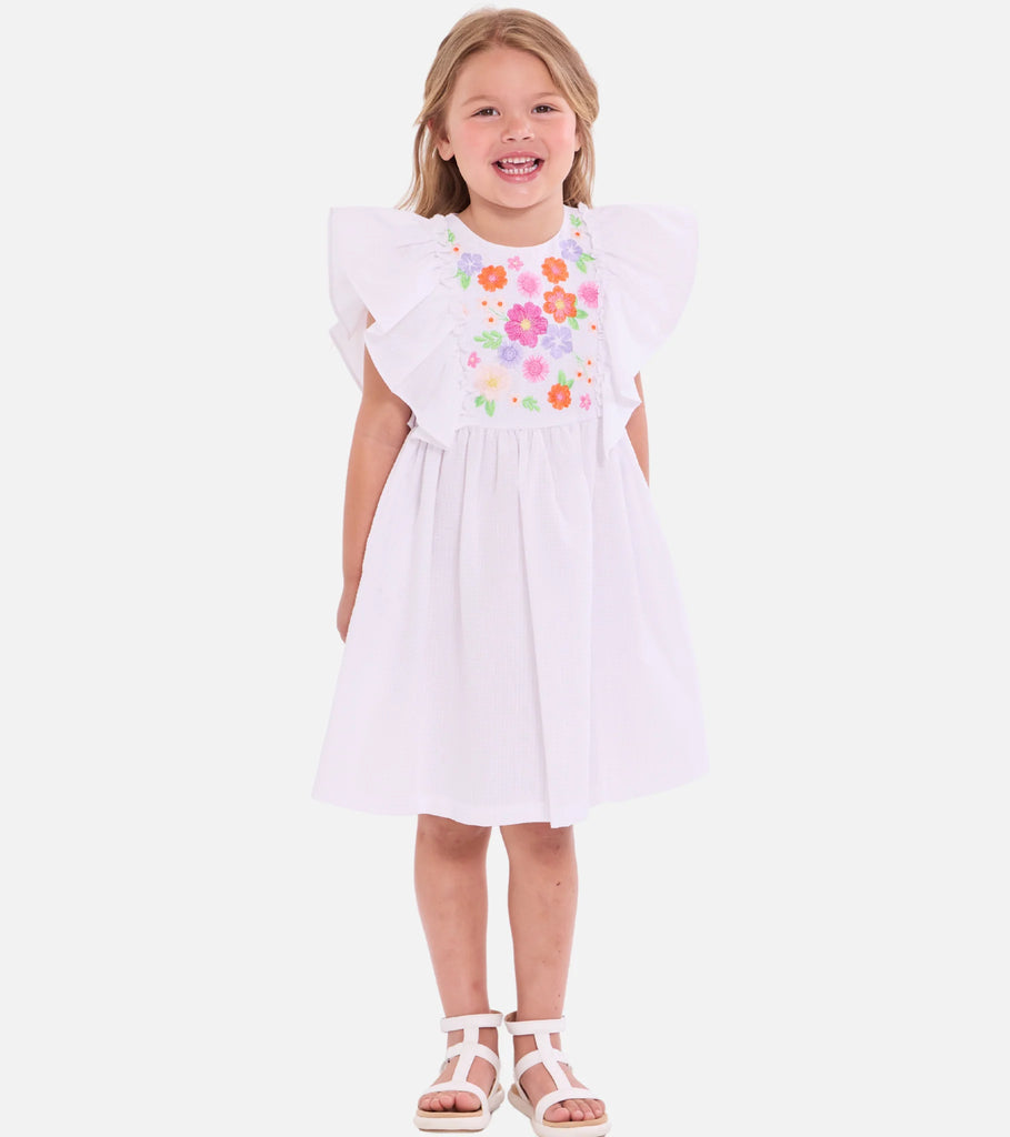 She'll want to wear this sweet summer sundress all season long! The Lacie Dress is 100% Cotton & features pinafore ruffles, windowpane checkered print and vibrant floral embroidered flowery. Matching panty included for infant & newborn sizes.