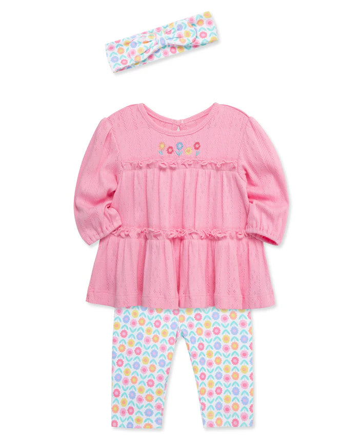 • Your little girl will blossom with flower power in her baby girls' 3-piece cotton tunic set! Charming flowers frame the neckline of this pink tunic paired with our modern floral print bottoms and a matching headband. This set is sure to become a staple in her wardrobe!