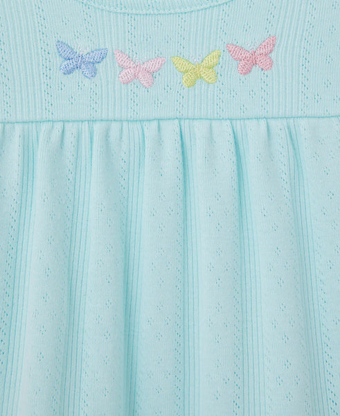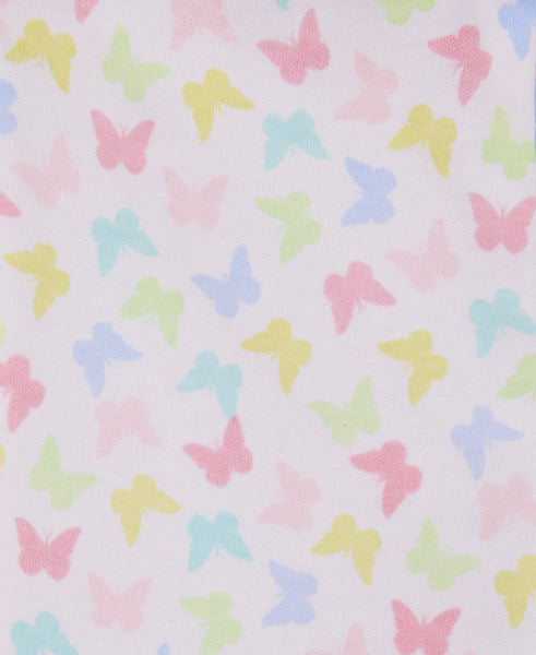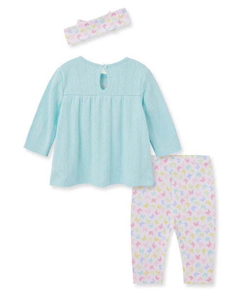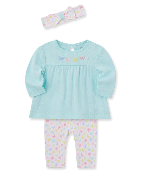 - Colorul butterflies patterns a pair of newborn baby girls' leggings layered under a soft knit tunic and crowned with a matching headband.