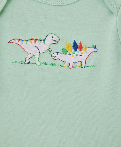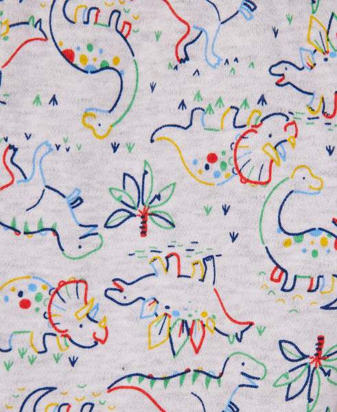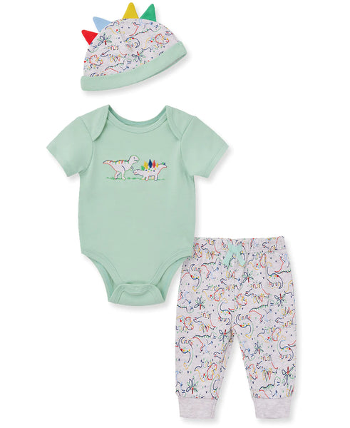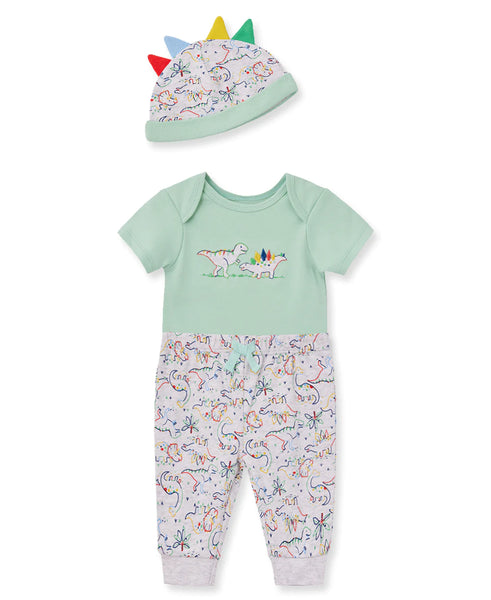 - Colorful dino print covers a baby boys' joggers and matching cap adorned with dino spikes. This outfit is tied together with a soft bodysuit.