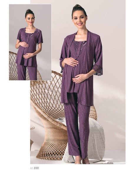 استمتعي بالاسترخاء الذي تمنحكي اياه بيجامات الحوامل التي تتكون من ثلاثة قطع حيث تاتي البلوزة الداخلية نصف كم ذات زراير تمنحك سهولة الرضاعه لطفلك, كما ياتي البنطال بسير وسيع يمنحك الراحة بجانة انه مزود بثلاثة اختيارات لمقاس البنطال يمكنك توسيعه او تصغيرة مما يناسبك, وياتي الروب قصير بدانتل جذاب وانيق يمنحك الراحة اثناء الحمل وبعد فترة الولادة
