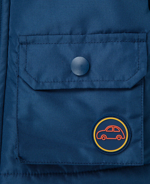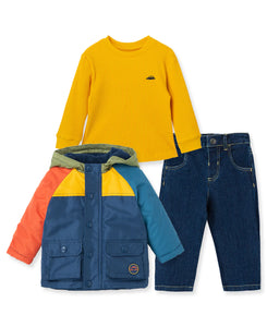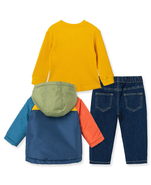 - A yellow long sleeve tee compliments this classic color-block jacket. Paired with denim pull-on pants, this toddler jacket set is full of style.