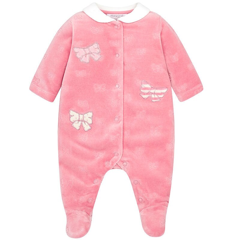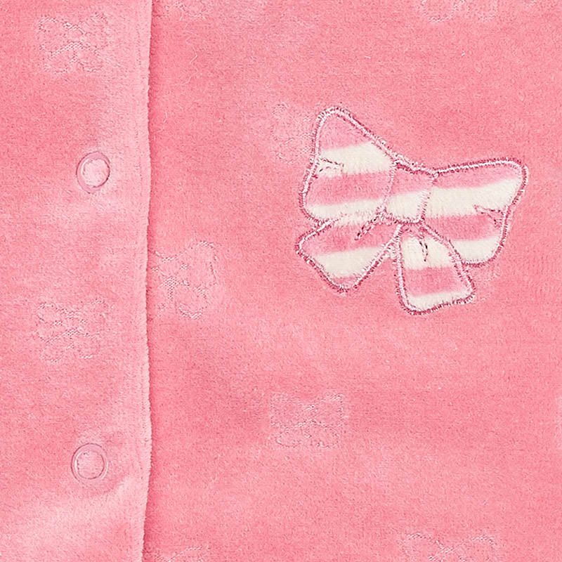 Long-sleeved pajamas for a newborn girl from 0 to 18 months. Round neck in different color. Snap button closure at front. Snap button closure at crotch. Warm cotton fabric with a soft and velvety touch. Ornamental elements: decorative applique, embroidery. This article is presented in a box from the Newborn line, ideal for gifts on special occasions. The larger sizes of this model have a non-slip sole.