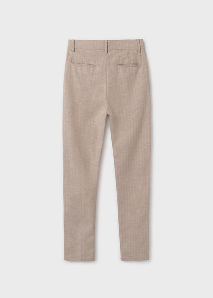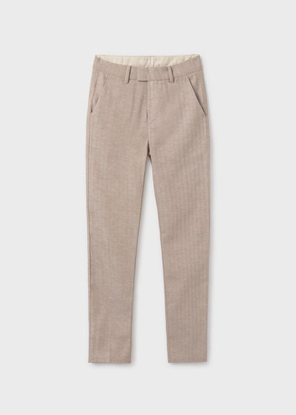 Boys' slim-fit chino trousers. Zip and button closure. Adjustable elastic waistband with buttons for a snug fit. Soft stretch cotton fabric. Pleated design. Functional front pockets. Functional back pocket. Plain design.