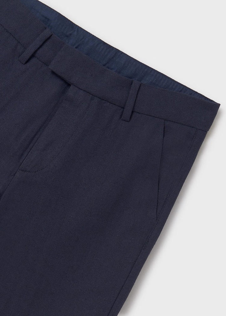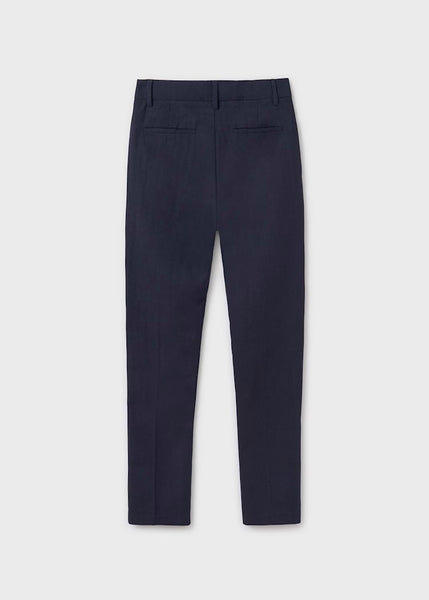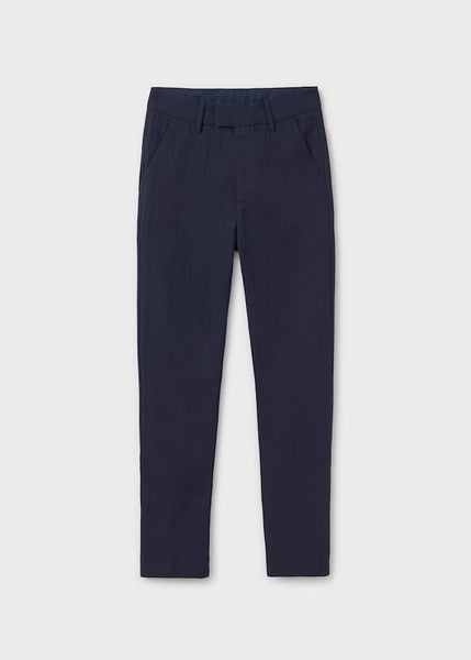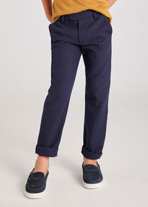 Boys' soft, slightly stretchy chino trousers. Zip and button closure. Adjustable elastic waistband with buttons for a snug fit. Fresh, contemporary linen-look fabric. Functional front pockets. Plain design.
