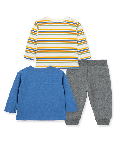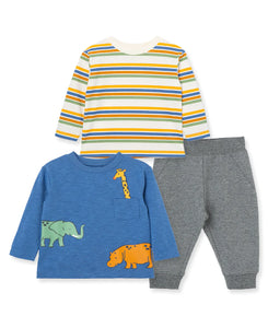 - King of the jungle gym. A friendly giraffe peeks out of the pocket of this boys' long sleeve tee paired with slip-on pants and an extra stripe shirt, in case the first one gets dirty.